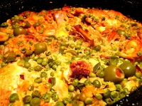 Paella, Crusty Bread, and a Bottle of Spanish Red